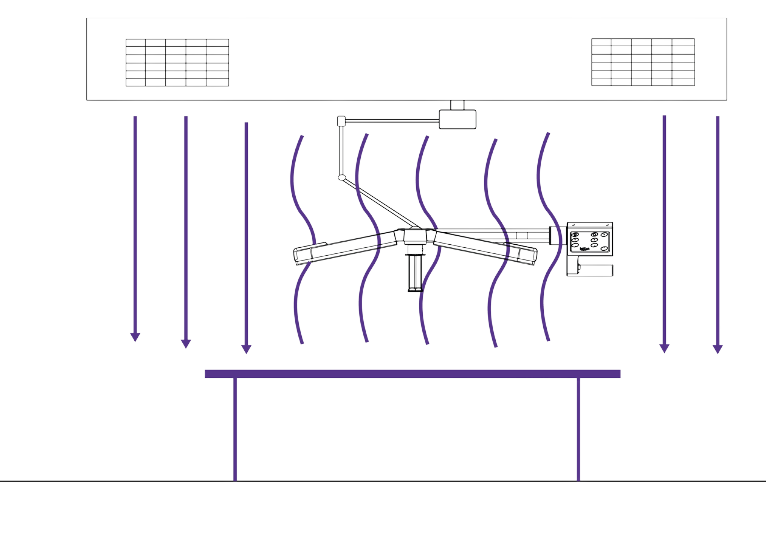 Le design innovant des des lampes opératoires Surgiris a été conçu pour n’entrainer qu’unefaible perturbation (28/29%) du flux laminaire selon la norme DIN 1946-4.